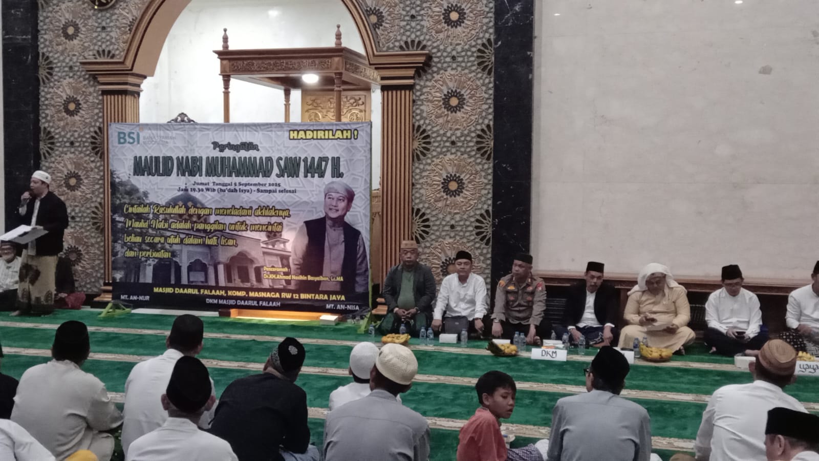 Bekasi Kota,- Dalam rangka menjaga dan memelihara situasi kamtibmas yang kondusif, Kapolsek Bekasi Barat, AKP Dr. H. Wahyudi, S.H., M.H., menghadiri kegiatan peringatan Maulid Nabi Muhammad SAW yang diselenggarakan di Masjid Daarul Falaah, Perumahan Mas Naga RW.012, Kelurahan Bintara Jaya, Kecamatan Bekasi Barat, Kota Bekasi, pada Jumat, 5 September 2025.