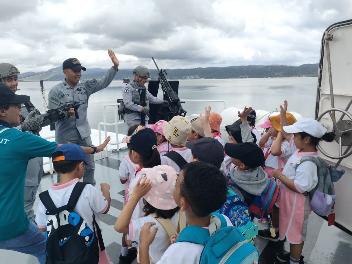 Ambon, 19 September 2025 (Bakamla RI/Indonesia Coast Guard) –KN. Kuda Laut-403 yang sedang bersandar menerima kunjungan edukasi dari siswa-siswi dan guru TK Kristen Kalam Kudus Kota Ambon dalam rangka pengenalan alat transportasi laut dan peran strategis Bakamla RI dalam menjaga keamanan dan keselamatan laut nusantara di Pangkalan Bakamla Ambon, Kota Ambon, Jumat (19/9/2025).