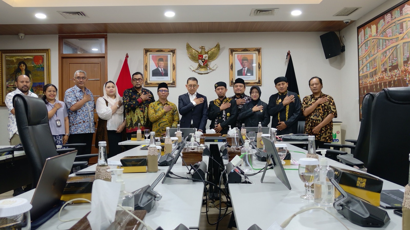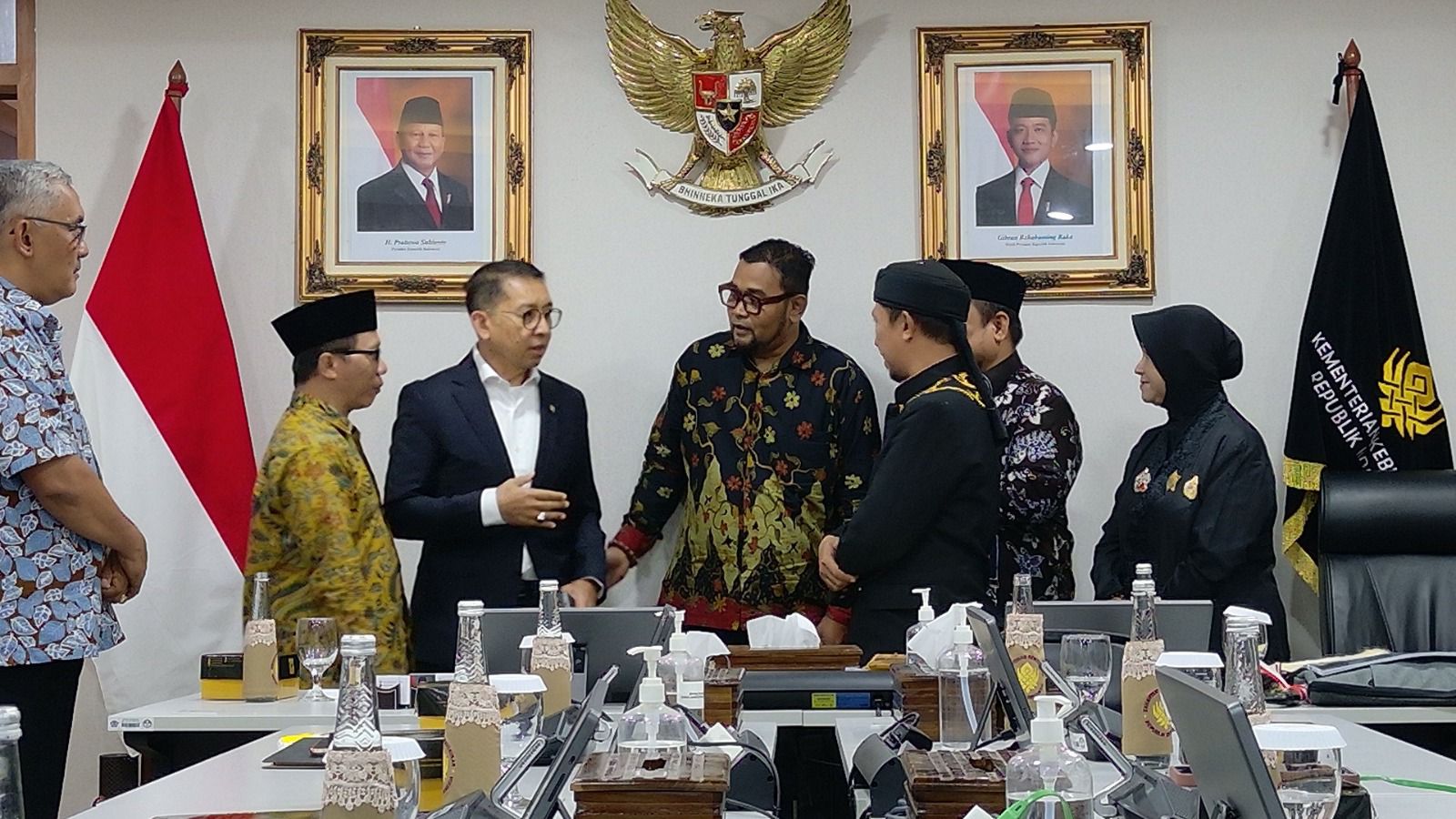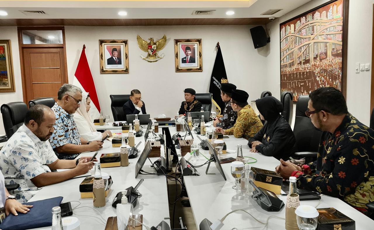 Ruang rapat siang itu tidak hanya diisi dengan diskusi formal. Di tengah suasana hangat, hadir para tokoh adat dan budayawan seperti Pangeran Ratu Jayakarta IX, R.B.H. Abi Munawir Al Madani Mertakusuma (Pangeran Abi), Bang Boim (M. Ridwan), G.K.R. Sekar Arum Dewi Intan, hingga K.H. Abi Kholaq. Dari pihak Kementerian, turut mendampingi Syamsul Hadi, Prof. Agus Mulyana, dan B.R.A. Putri Woelan Sari Dewi, bersama staf dan tenaga ahli lainnya.