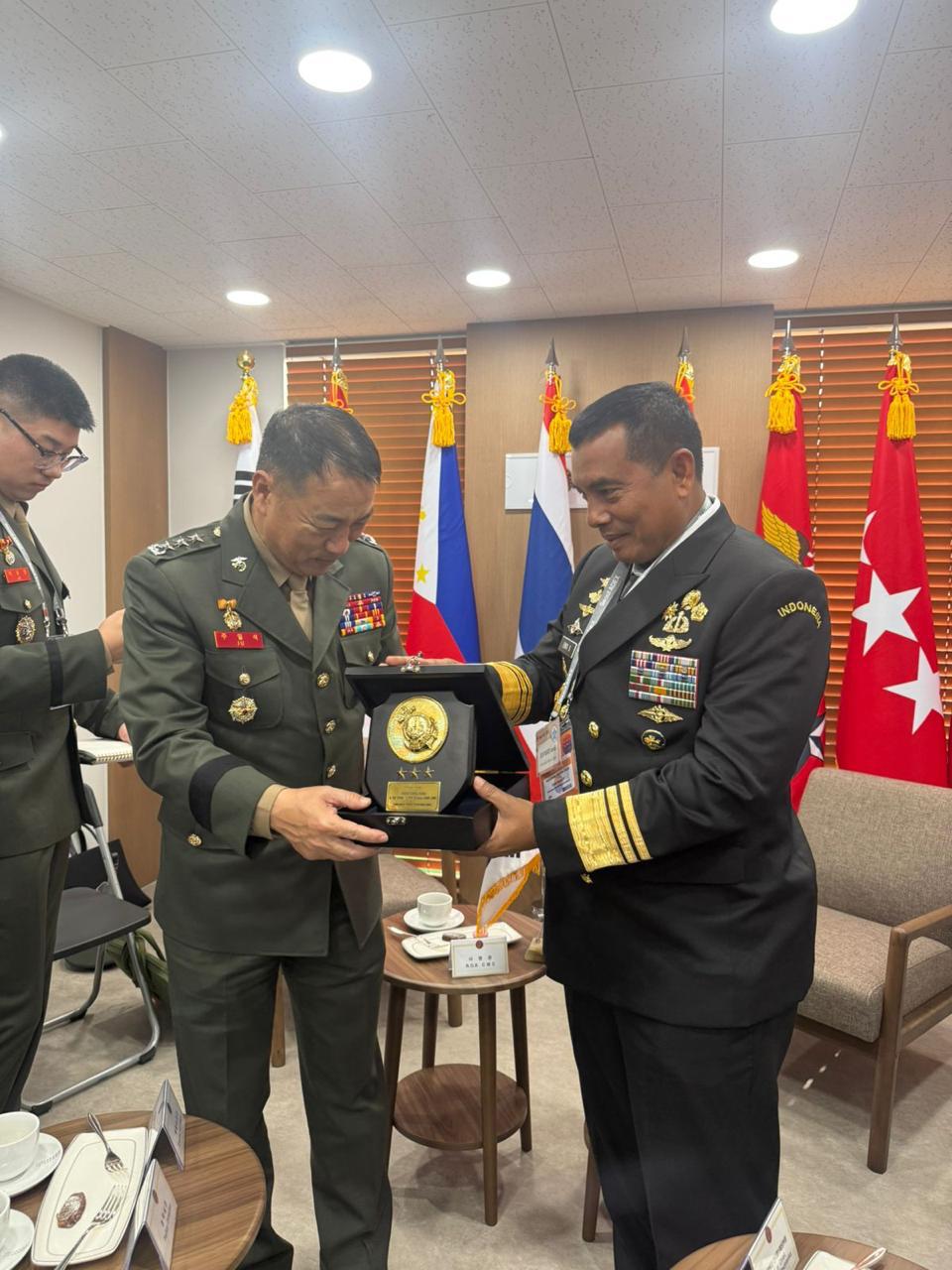 Dispen Kormar TNI Angkatan Laut (Korea Selatan). Panglima Korps Marinir (Pangkormar) Letnan Jenderal TNI Dr. Endi Supardi, S.E., M.M., M.Tr.Opsla., CHRMP., CRMP., melaksanakan courtesy call dengan Komandan Republic of Korea Marine Corps (ROKMC), Letnan Jenderal Ju Ill Seok, bertempat di International Exhibition Center, Seoul, Korea Selatan, Selasa (21/10/2025).