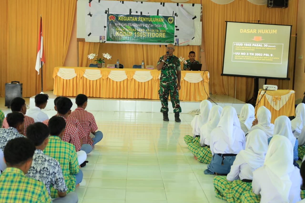 Tidore Kepulauan — Dalam rangka menanamkan semangat cinta tanah air sejak dini, Satuan Tugas TNI Manunggal Membangun Desa (TMMD) ke-126 Kodim 1505/Tidore memberikan materi Wawasan Kebangsaan kepada para pelajar SMA Negeri 7 Tidore Kepulauan, bertempat di Aula sekolah Desa Lifofa, Kecamatan Oba Selatan, Kota Tidore Kepulauan, Senin (20/10/2025).