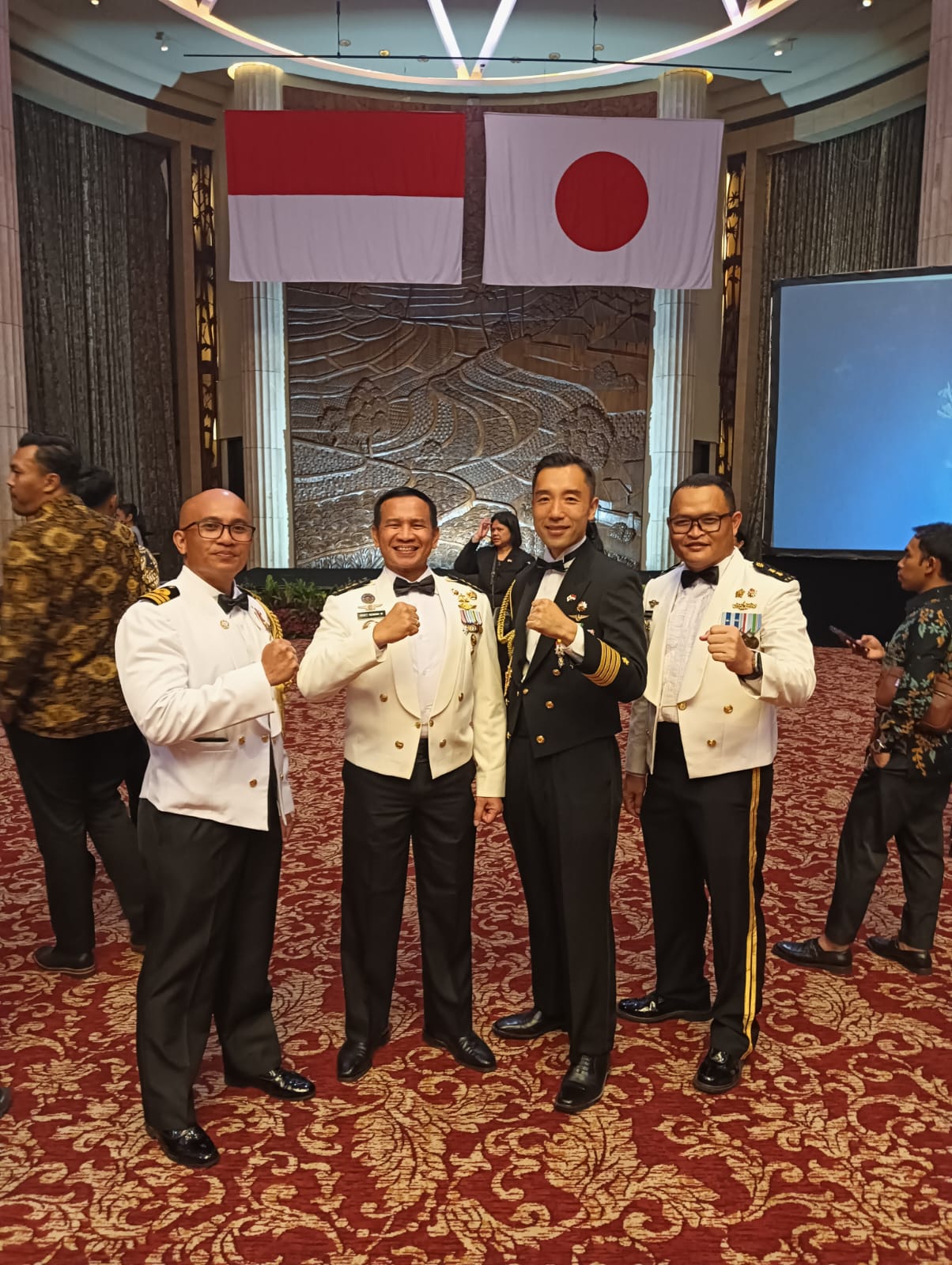 Acara resepsi juga diisi dengan penyerahan papan nama organisasi alumni studi TNI JSDF “KATANA”, ucapan bersulang (toast), serta jamuan makan malam bersama yang berlangsung dalam suasana akrab dan penuh kehangatan. Kegiatan berjalan aman, tertib, dan lancar, mencerminkan eratnya hubungan persahabatan dan kerja sama antara TNI dan Japan Self Defence Force dalam membangun kawasan Indo-Pasifik yang damai, stabil, dan tangguh.