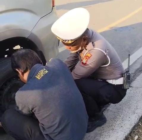 Kota Bekasi – Sebagai wujud nyata kepedulian dan pelayanan prima kepada masyarakat, Kanit Turjawali Satlantas Polres Metro Bekasi Kota, AKP Parwoto, bersama anggotanya menunjukkan aksi humanis dengan membantu seorang pengemudi kendaraan minibus yang mengalami kendala ban pecah di kawasan Bunderan Piramid Summarecon, Bekasi, pada Selasa pagi (4/11).