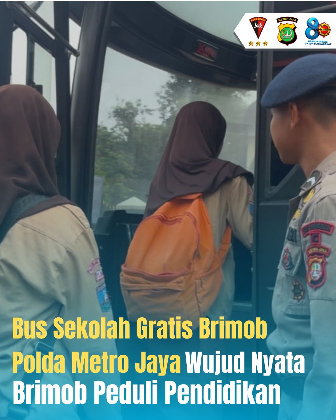 Personel Batalyon C Pelopor Satuan Brimob Polda Metro Jaya melaksanakan kegiatan sosial berupa pelayanan Bus Sekolah Gratis bagi para pelajar yang akan berangkat ke sekolah.