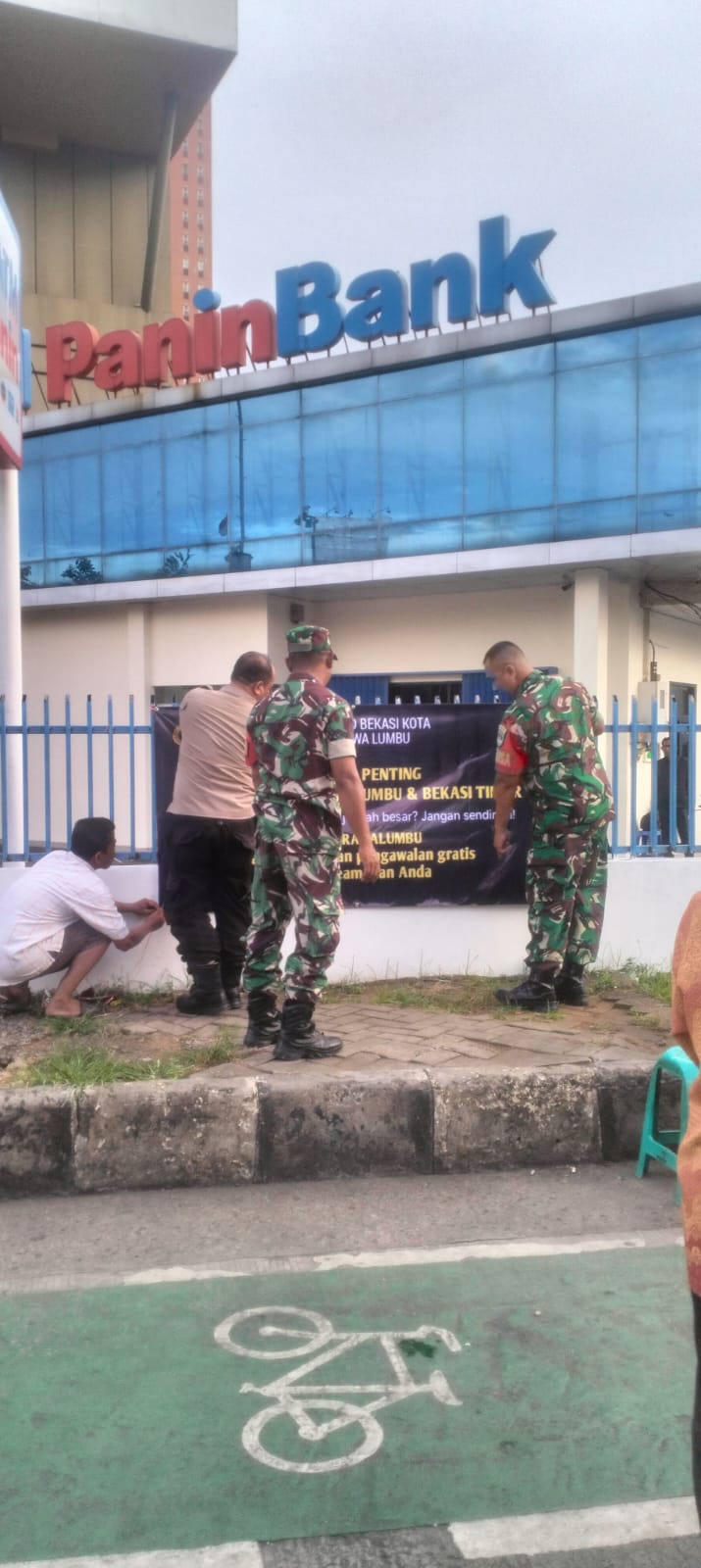 Pemasangan spanduk dilakukan oleh Bhabinkamtibmas Aipda Jamal Lulail, dibantu Babinsa Serka Suwito dan Serka Isa Puryanto, serta petugas keamanan bank.