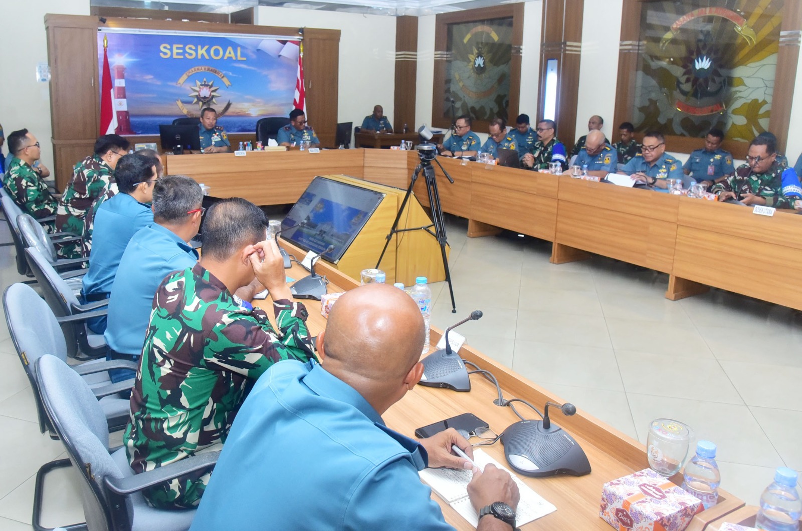 Komandan Sekolah Staf dan Komando Angkatan Laut (Danseskoal) Laksamana Muda TNI Ariantyo Condrowibowo menerima paparan persiapan Hari Ulang Tahun (HUT) Ke-63 Seskoal dengan pemapar Kolonel Marinir Achmad Sochfan, S.A.P., M.Han. Pemaparan kesiapan Seminar Akhir Pasis Dikreg Seskoal angkatan ke-64 TA 2025 dengan pemapar Mayor Laut (P) Kukuh Dwiyanto, bertempat di ruang rapat utama Danseskoal, gedung Samadikun Seskoal, Cipulir, Kebayoran Lama, Jakarta Selatan, Selasa (18/11/2025).