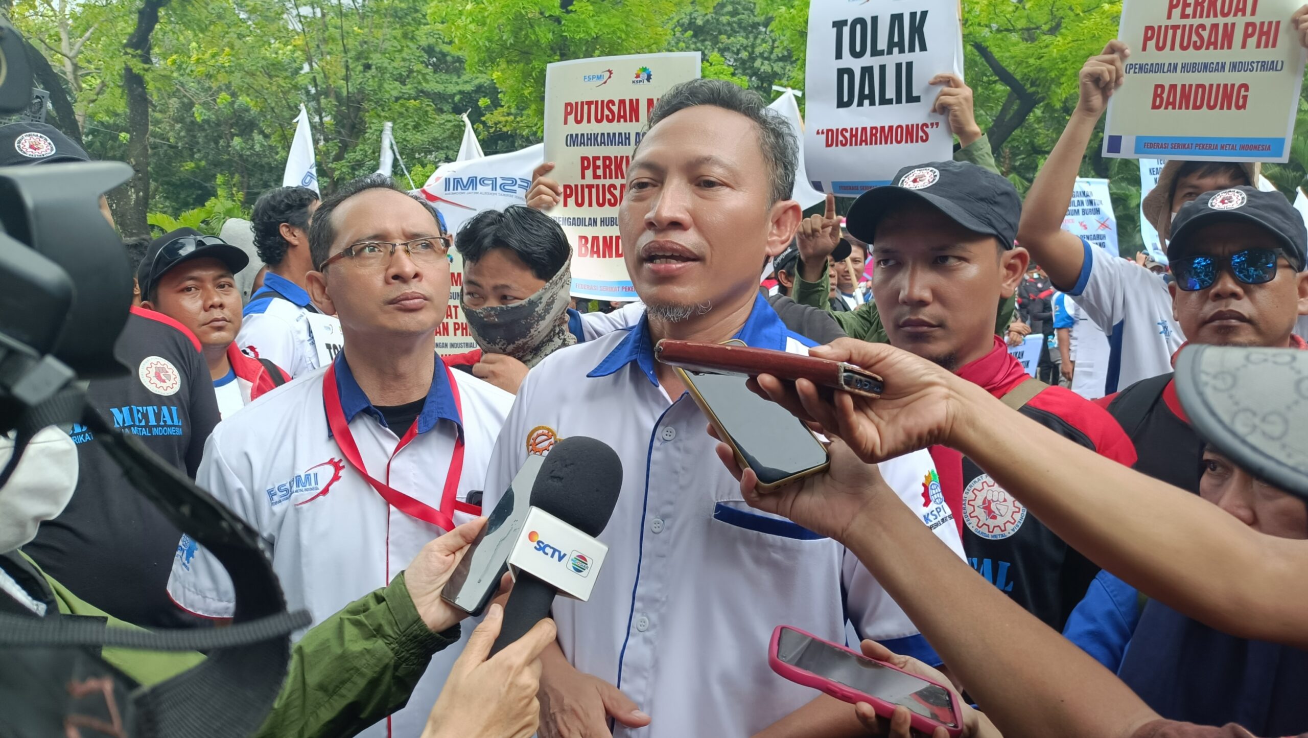 Presiden FSPMI Riden Hatam Aziz menegaskan bahwa aksi ini merupakan tuntutan untuk menegakkan hukum yang sudah jelas mengatur serikat pekerja. “Jika melihat putusan bebas Pengadilan Hubungan Industrial (PHI) Bandung, perusahaan ternyata tidak ada sedikit pun bukti pengeluaran untuk melakukan PHK. Pengadilan Hubungan Industrial telah memutuskan agar dua pengurus serikat ini dipekerjakan kembali,” jelas Riden.