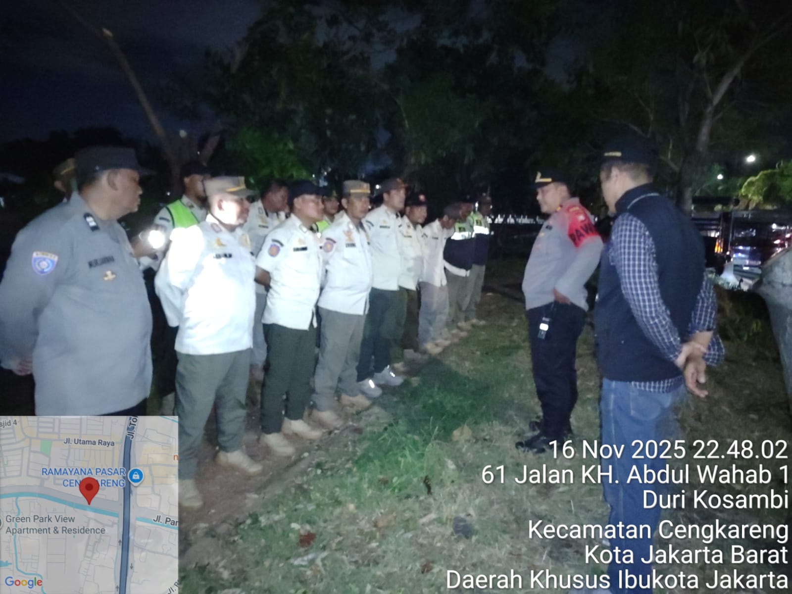 Jakarta Barat, Dalam rangka menindaklanjuti aduan masyarakat terkait adanya dugaan Prostitusi Sesama Jenis serta mengantisipasi potensi kerawanan di area pertamanan Kali Mookervart, Jl. Daan Mogot KM 11, Polsek Cengkareng bersama Satpol PP Kecamatan Cengkareng menggelar patroli gabungan, Minggu (16/11/2025) malam.