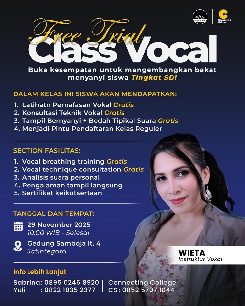 Sebagai kegiatan pengenalan kepada publik, Wieta Musik dan Connecting College akan menggelar Trial Class Vocal gratis pada Sabtu (29/11), di Gedung Samboja, Jatinegara, Jakarta Timur, mulai pukul 10.00 WIB hingga selesai.