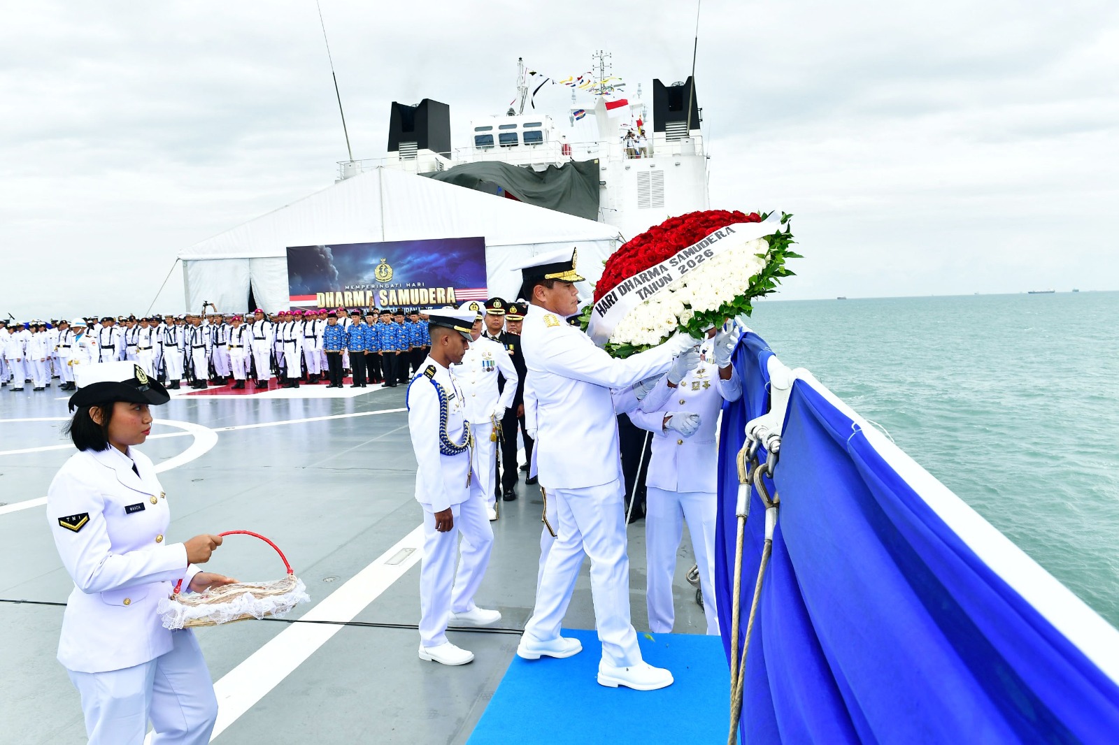 Komandan Sekolah Staf dan Komando Angkatan Laut (Danseskoal) Laksamana Muda TNI Ariantyo Condrowibowo menghadiri upacara dan tabur bunga di laut dalam rangka memperingati Hari Dharma Samudera tahun 2026, dengan Inspektur Upacara (Irup) Kepala Staf Angkatan Laut (Kasal) Laksamana TNI Dr. Muhammad Ali, S.E., M.M., M.Tr.Opsla., yang dihadiri Wakasal Laksamana Madya TNI Erwin S. Aldedharma, S.E., M.M., M.Sc., dan Ketua Umum Jalasenastri Ny. Fera Muhammad Ali, bertempat di KRI dr. Radjiman Wedyodiningrat (RJW)-992 yang berlayar di Teluk Jakarta, Kamis (15/01/2026).