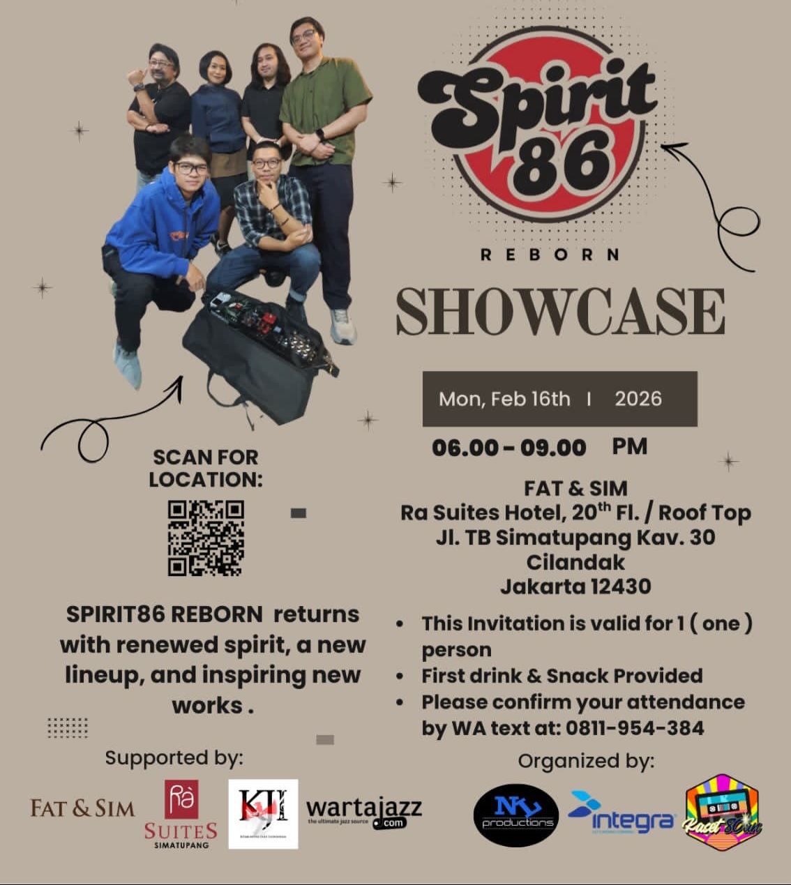 Di bawah payung OHMYJAZZ! Management, Spirit 86 Reborn siap menandai kebangkitan mereka lewat showcase eksklusif di Fat & Sim, Ra Suites Hotel, kawasan Cilandak, Senin, 16 Februari 2026.